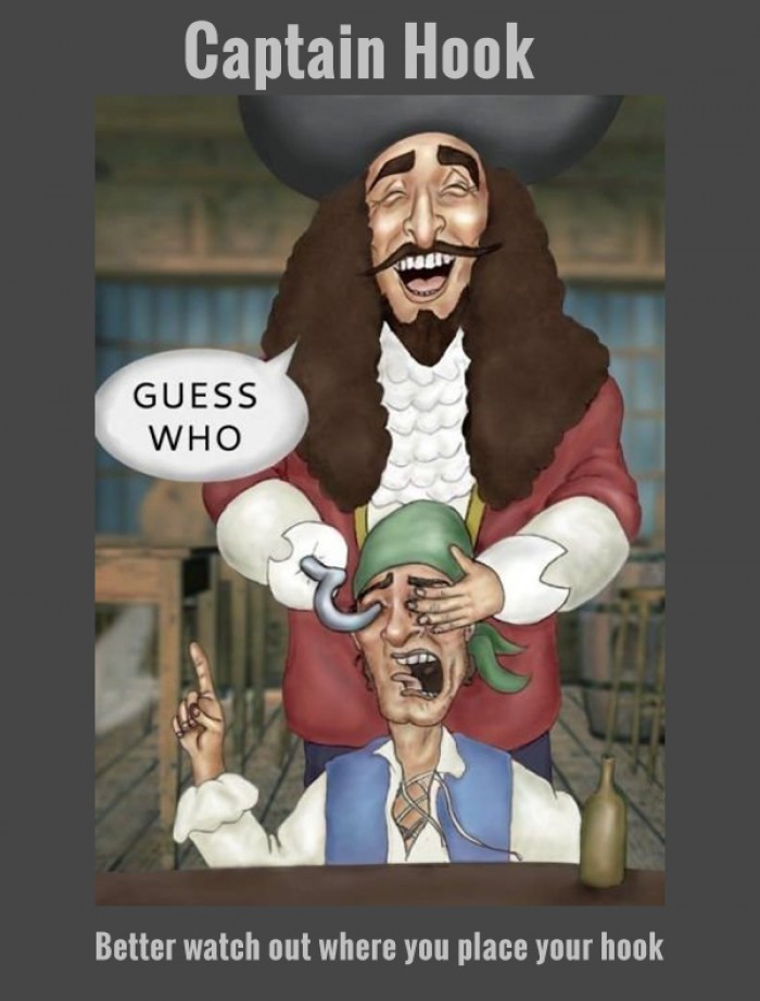 "Captain Hook. Guess Who!? Better watch out where you place your hook." Captain Hook is a Peter Pan's archenemy since Peter Pan has cut his hand and fed crocodile with it. He placed a hook to replace his hand and that's what inspired this funny illustration.