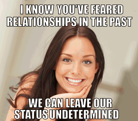 I know you've feared relationships in the past Submitted By: 9buz on July 30, 2013 0 0 4511 « Previous Next » Score: 4.8 / 6 Category: Funny Download this image I know you've feared relationships in the past. We can leave our status undetermined.