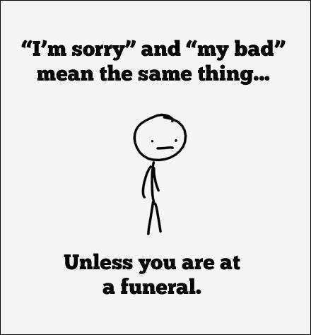 "I'm sorry" and "my bad" mean the same thing unless you are at a funeral Submitted By: 9buz on January 12, 2014 0 0 5649 « Previous Next » Score: 4.8 / 6 Category: Funny Download this image "I'm sorry" and "my bad" mean the same thing unless you are at a funeral :-)