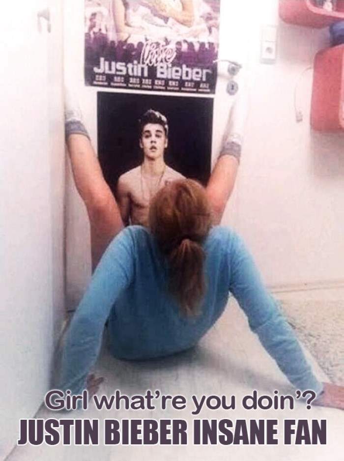 "Girl what're doin'? Justin Bieber insane fan." Still can't believe that one boy like Justin can have such an influence on young ladies. I think this is what they call fanatism.
