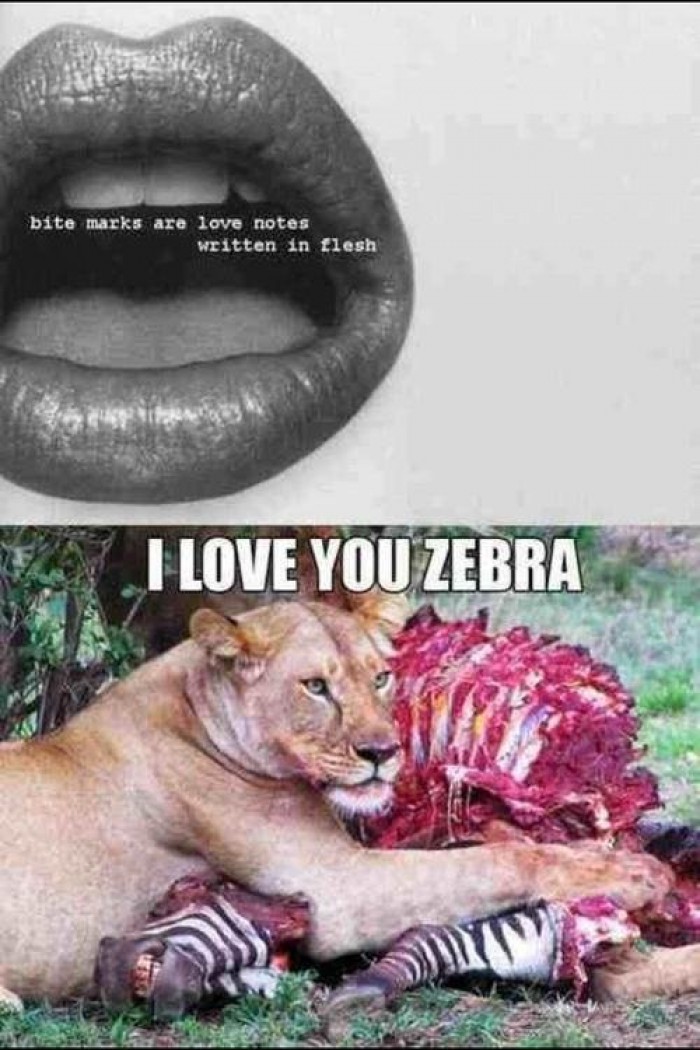 Lion - I love you Zebra Submitted By: 9buz on September 12, 2014 0 0 6401 NSFW! This content has been marked as Not Safe For Work, login to view this content login or signup « Previous Next » Score: 4.8 / 6 Category: Animals Download this image Bite makrs are love notes written in flesh. I love you zebra