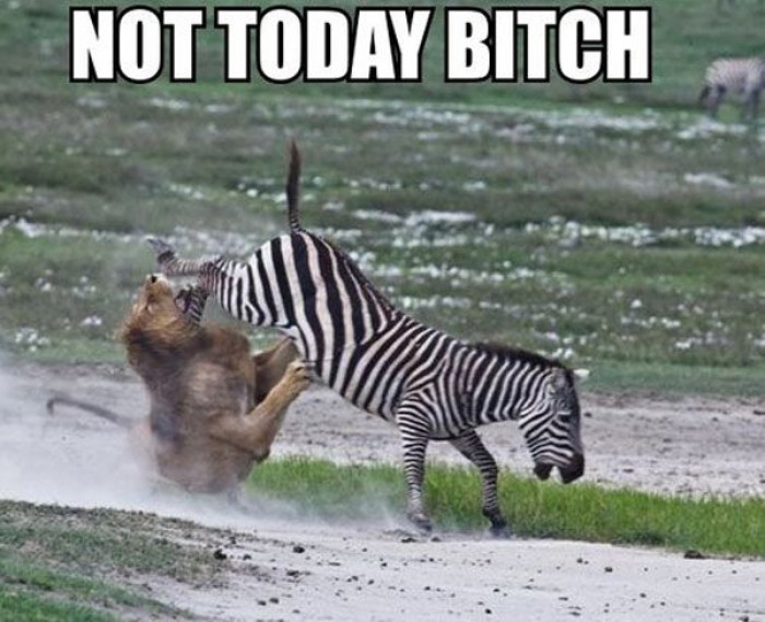 Not today! Zebra has decided to... Submitted By: Deep on October 3, 2014 0 0 5746 NSFW! This content has been marked as Not Safe For Work, login to view this content login or signup « Previous Next » Score: 4.8 / 6 Category: Funny Download this image Not today bitch! Zebra has decided not to be a lion lunch.