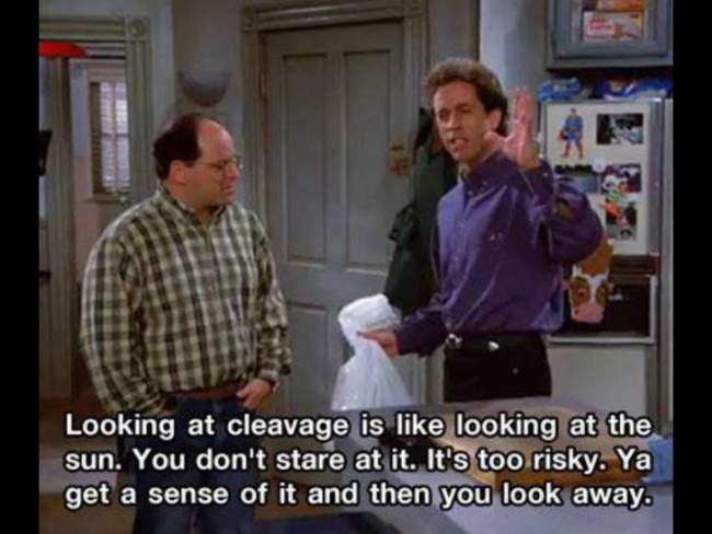 Looking at cleavage is like looking at the sun. you don't stare at it. It's too risky. Ya get a sense of it and the you look away.