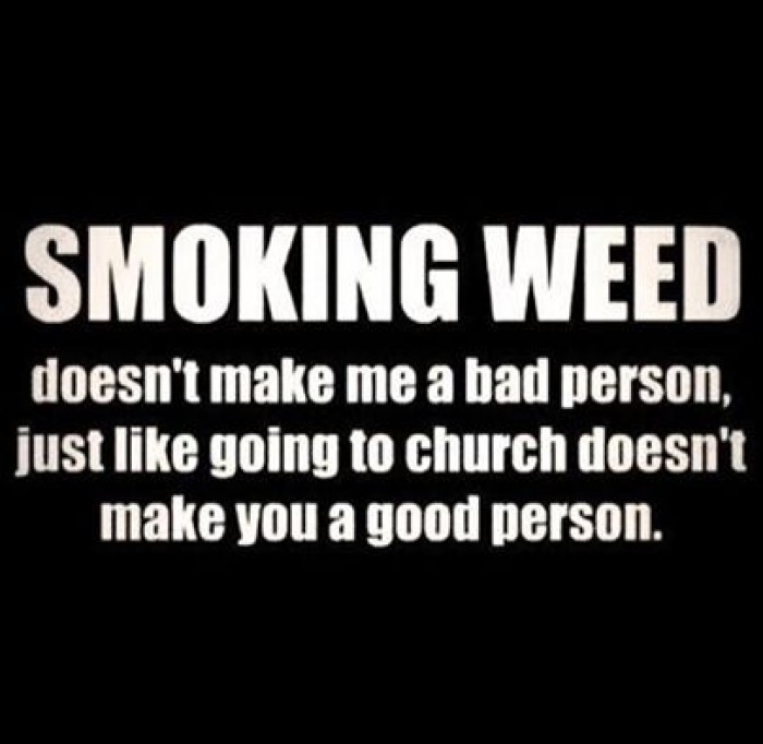 Smoking weed doesn't make me a bad person... Submitted By: 9buz on September 1, 2014 0 0 7050 NSFW! This content has been marked as Not Safe For Work, login to view this content login or signup « Previous Next » Score: 4.8 / 6 Category: Lifestyle Download this image Smoking weed doesn't make me a bad person, just like going to church doesn't make you a good person.