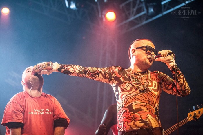 Picture form Turbo Punk Folk band Brkovi concert. Front man is singing and passing a beer to the man wearing a T-shirt that says "I shaver my balls for this"