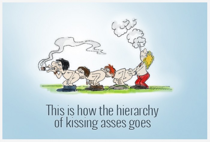 The kissing asses hierarchy Submitted By: teamplayer on October 7, 2014 0 0 8720 NSFW! This content has been marked as Not Safe For Work, login to view this content login or signup « Previous Next » Score: 4.8 / 6 Category: Comics Download this image "This is how the hierarchy of kissing asses goes." If you do it, make sure you have followers behind :)