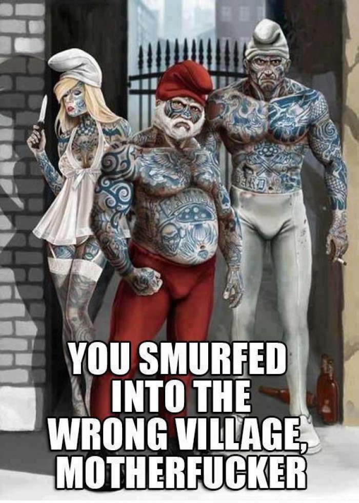 You smurfed into the wrong village! Tattooed Smurfs look really scary :) The Smurfs (French: Les Schtroumpfs, Dutch: De Smurfen) is a Belgian comic and television franchise centered on a fictional colony of small blue creatures that live in mushroom-shaped houses in the forest.